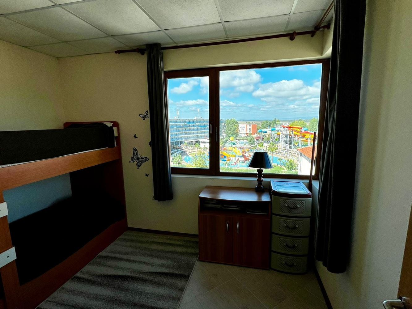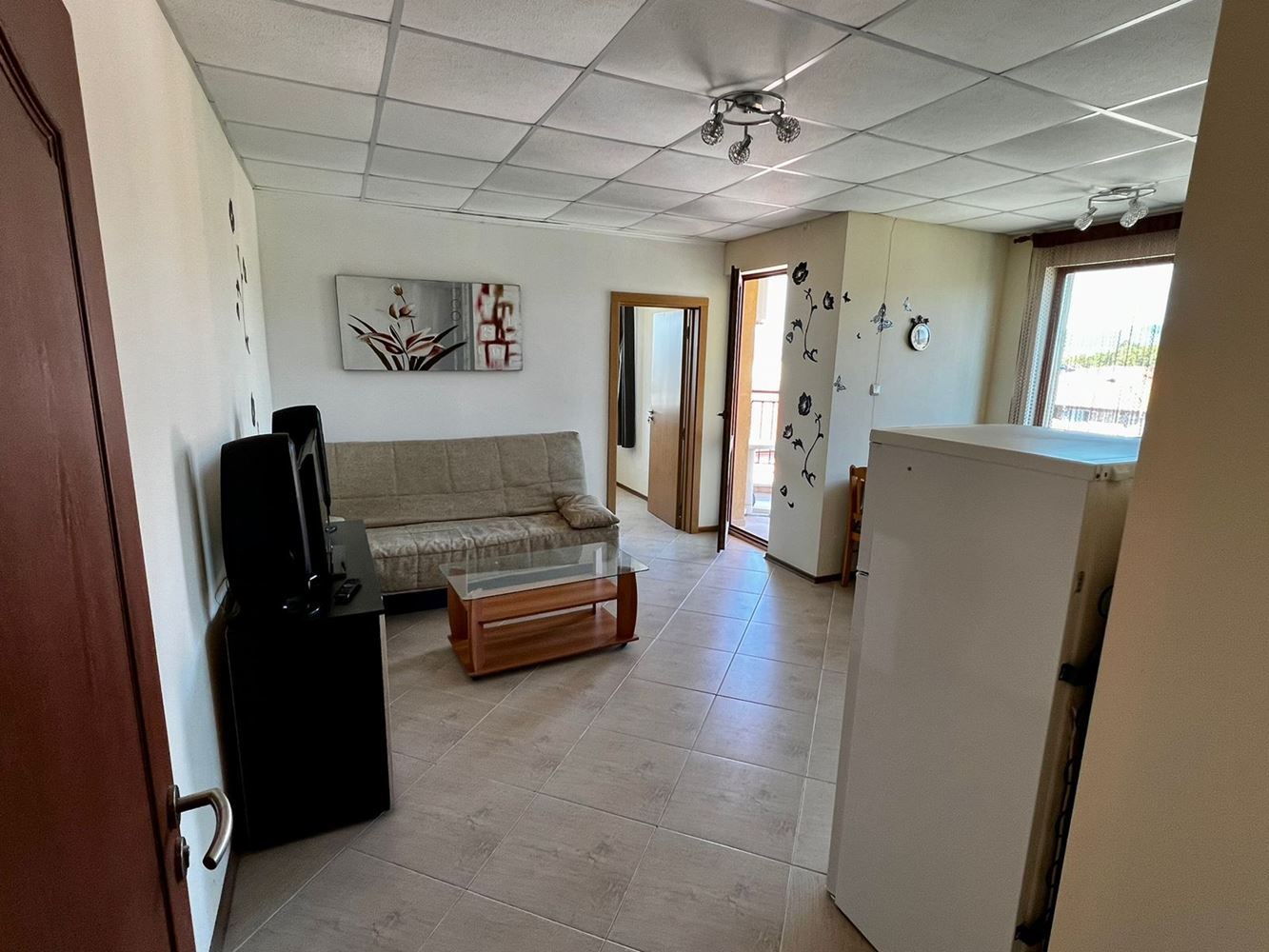 Duży przytulny apartament z dwiema sypialniami w kompleksie mieszkalnym w Słonecznym Brzegu, w idealnym centrum. Jest tu bogata infrastruktura, wiele sklepów, marketów, restauracji i kawiarni na każdy gust, przystanki autobusowe. Duży supermarket, otwarty przez cały rok, znajduje się zaledwie sto metrów od apartamentu. Całkowita powierzchnia mieszkania wynosi 77 m2, znajduje się na szóstym piętrze. W budynku znajduje się winda. Mieszkanie składa się z przedpokoju, salonu z kuchnią, sypialni, łazienki z toaletą i balkonu. Kompleks znajduje się na terenie zagospodarowanym z terenami zielonymi, basenem, miejscem do opalania i relaksu, placem zabaw dla dzieci. Do dyspozycji gości jest lobby, recepcja, restauracja, bar na świeżym powietrzu, parking zewnętrzny. Na parterze znajdują się sklepy. Kompleks jest ogrodzony i strzeżony przez cały czas. Na życzenie istnieje możliwość wynajęcia apartamentu.