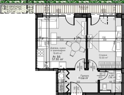 Nieruchomość ma powierzchnię całkowitą 67,61 m², znajduje się na parterze i jest skierowana na północ — praktyczne rozwiązanie zapewniające przyjemny chłód w letnie miesiące. Układ mieszkania jest funkcjonalny i wygodny: przestronny salon z aneksem kuchennym i wyjściem do prywatnego ogródka, przytulna sypialnia, łazienka z WC, przedpokój oraz taras. Prywatny ogródek nadaje nieruchomości charakter domu — idealne miejsce na poranną kawę, zieloną strefę, plac zabaw dla dzieci lub kącik dla zwierząt.