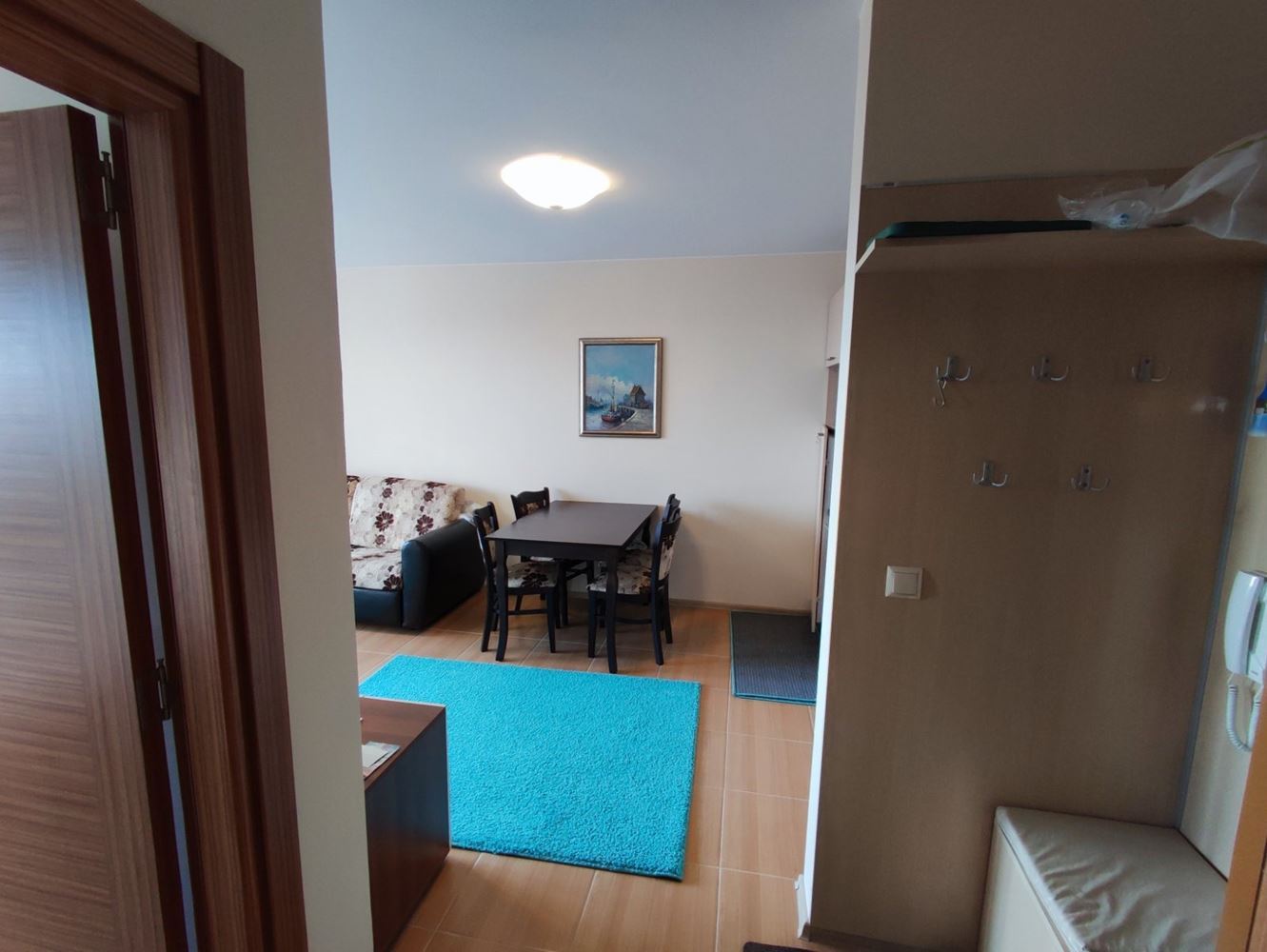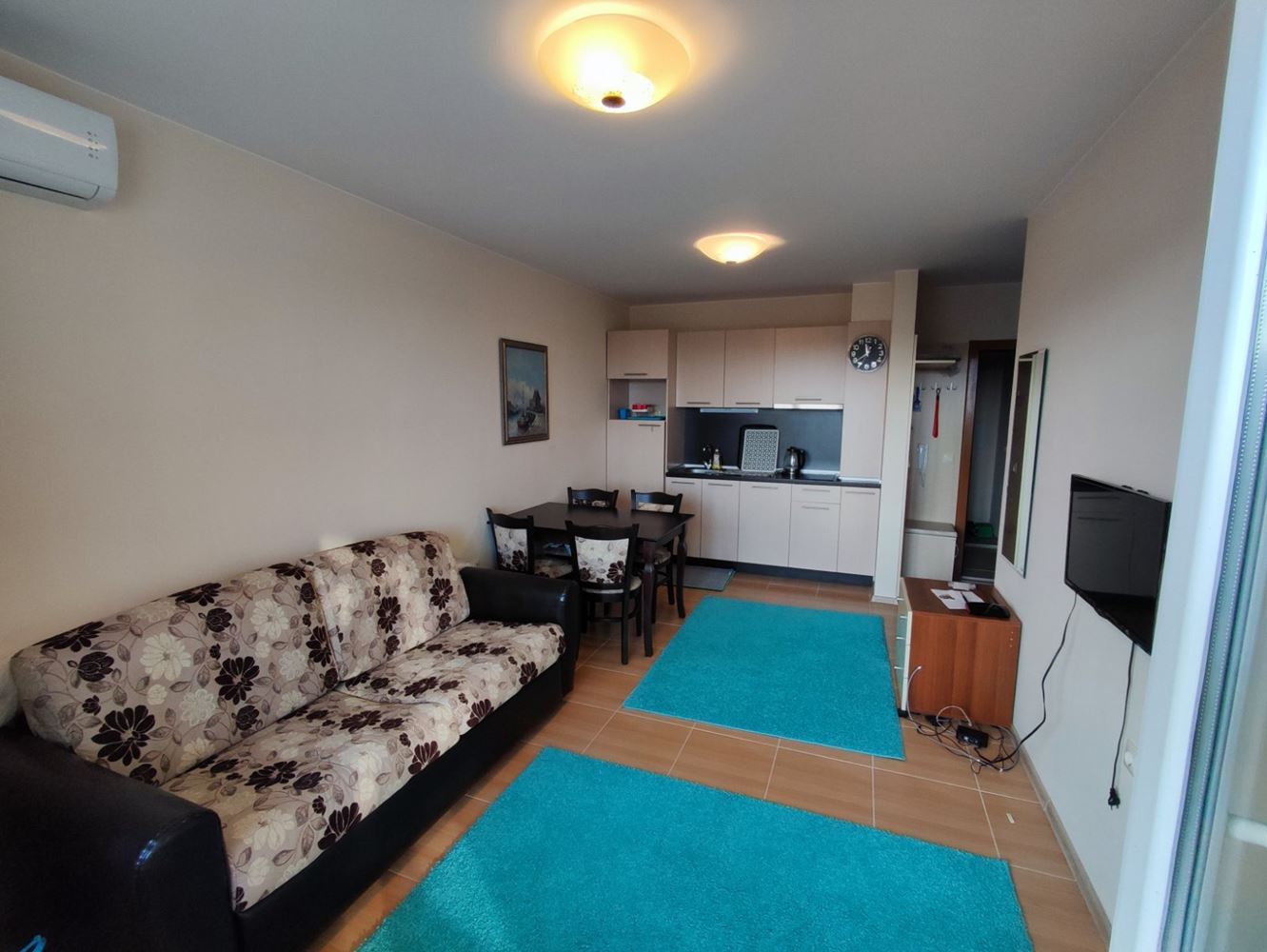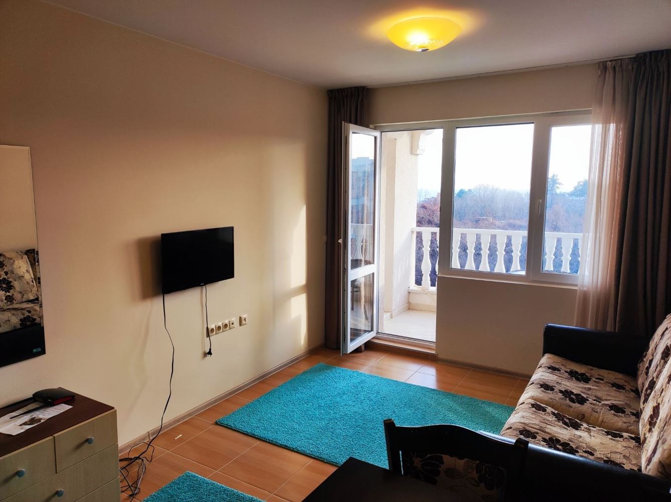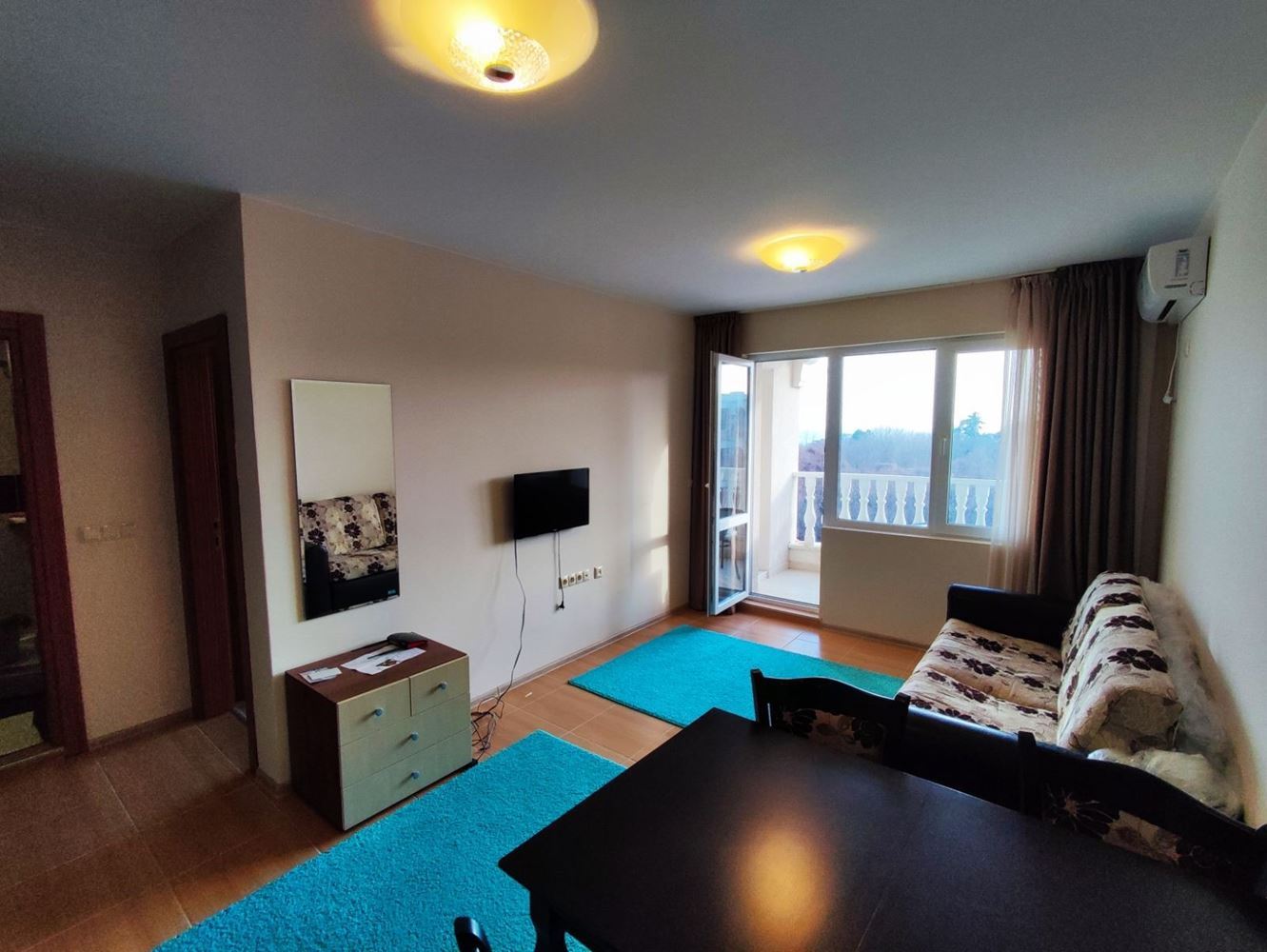 Przedstawiamy dwupokojowe mieszkanie położone w pięknym mieście Nesebyr. Z całkowitą powierzchnią 51 m², ta nieruchomość oferuje komfort i wygodę dla całej rodziny. Mieszkanie wyróżnia się funkcjonalnym układem: jasny salon z aneksem kuchennym i częścią wypoczynkową oraz przestronny taras z widokiem na morze. W pełni umeblowana sypialnia oraz nowoczesna łazienka dodatkowo zwiększają wygodę.
