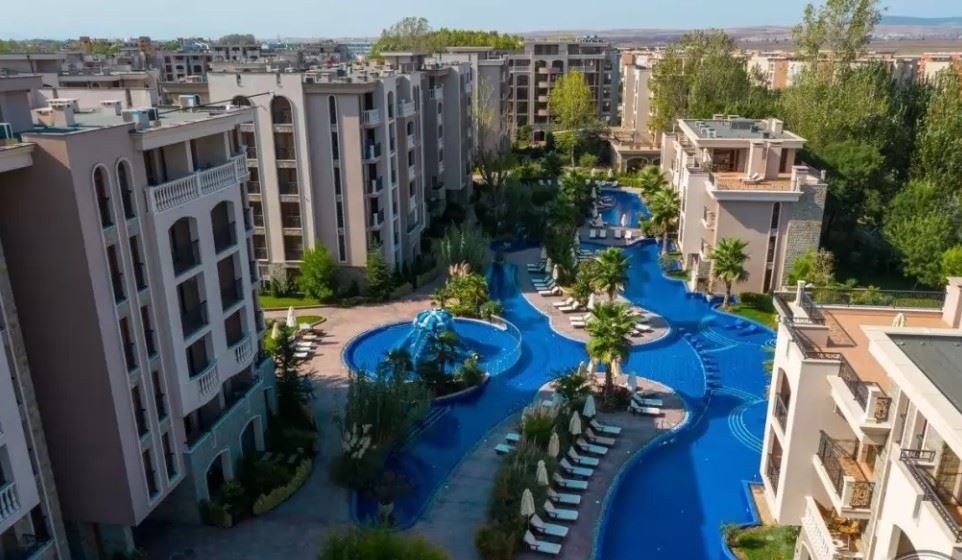 Kompleks, w którym znajduje się mieszkanie, został zaprojektowany jako samodzielna zielona oaza. Na jego terenie znajduje się ogromny zielony park, idealny do spacerów, aktywności na świeżym powietrzu oraz organizacji wydarzeń sportowych i społecznych. Dwa sztuczne jeziora, otoczone palmami i wygodnymi hamakami, potęgują poczucie harmonii z naturą i oferują idealne miejsca do wypoczynku. Dla rodzin z dziećmi kompleks oferuje wyjątkowo bogatą infrastrukturę – cztery place zabaw oraz dwa mini aquaparki, zapewniające rozrywkę najmłodszym przez cały dzień. Miłośnicy wodnych atrakcji docenią dziesięć basenów z wydzielonymi strefami dla dzieci, rozmieszczonych w sposób zapewniający łatwy dostęp z każdej części kompleksu. Prawdziwą dumą i unikalnym atutem jest jedyny w Słonecznym Brzegu 50-metrowy basen olimpijski, wyposażony w system filtracji wody bez użycia chemikaliów. Dla osób aktywnych dostępne są jedno wewnętrzne i jedno zewnętrzne centrum fitness, umożliwiające prowadzenie zdrowego trybu życia w nowoczesnym i przyjaznym otoczeniu. Strefa relaksu obejmuje salon kosmetyczny, trzy centra SPA oraz trzy sauny, stworzone z myślą o pełnej regeneracji.
