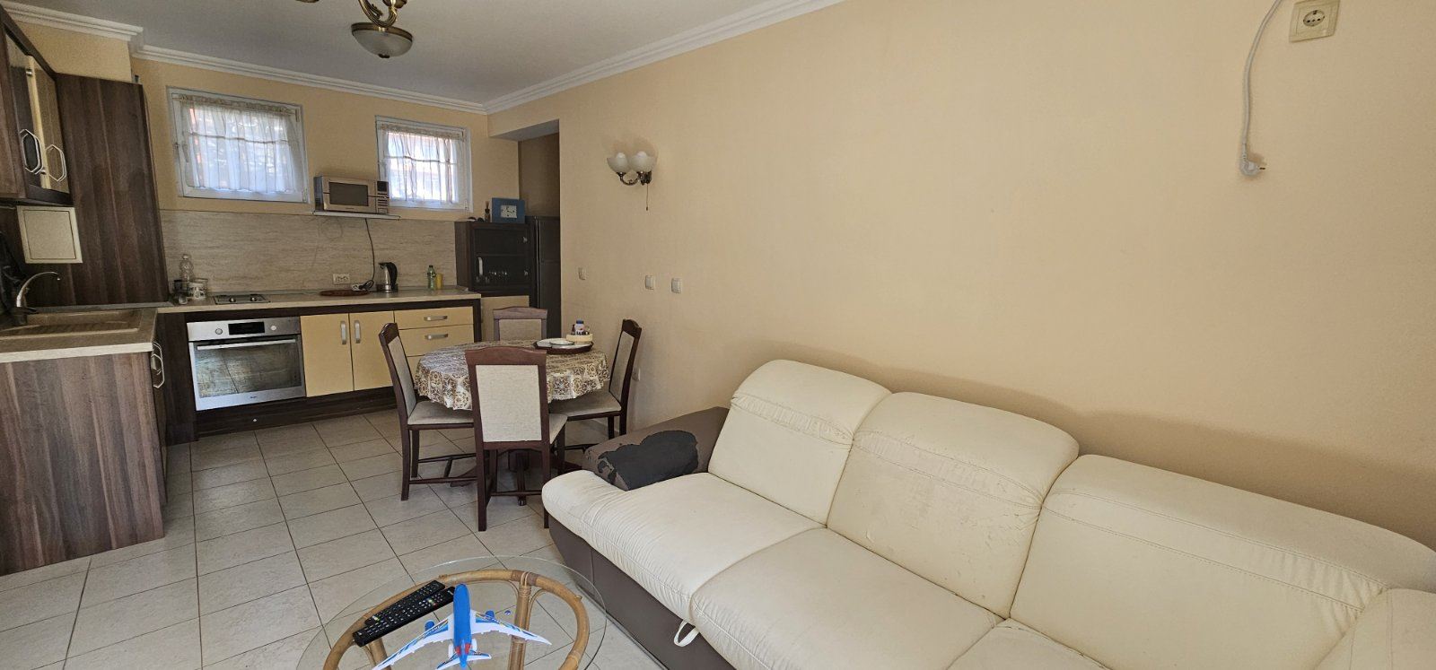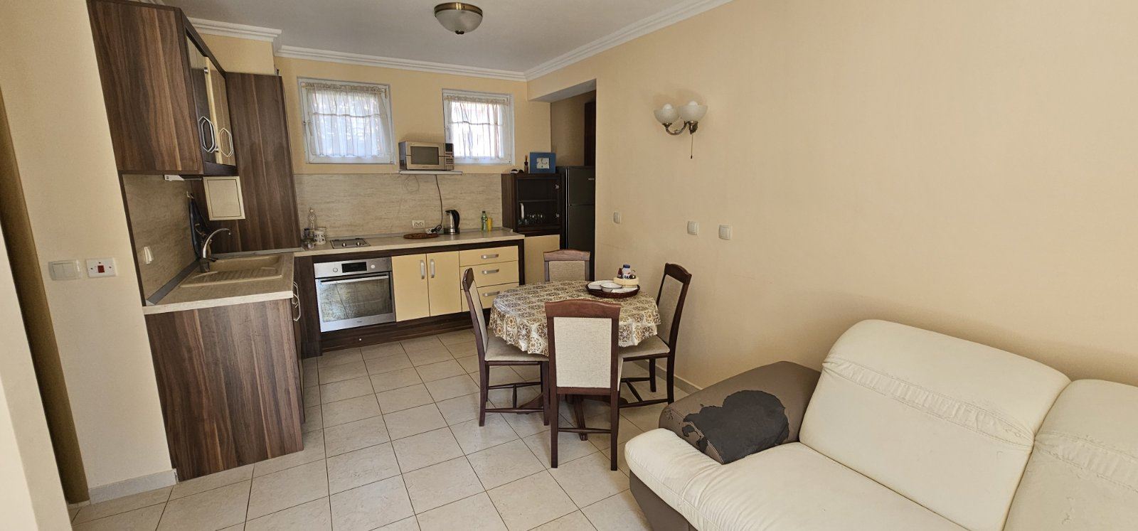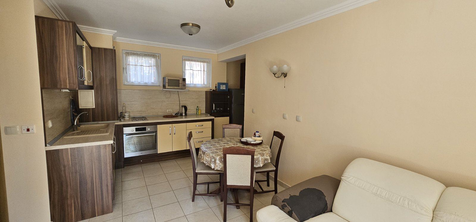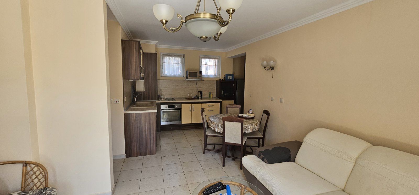Mieszkanie wyróżnia się przemyślanym układem, który zapewnia wygodę w codziennym użytkowaniu. Przedpokój prowadzi do przestronnego i jasnego salonu z w pełni wyposażoną kuchnią, odpowiednią do codziennego użytku i spotkań rodzinnych. Dwie sypialnie są niezależne, oferując spokojną i przytulną atmosferę sprzyjającą wypoczynkowi. Do dyspozycji jest łazienka z toaletą oraz oddzielna toaleta, co stanowi duże udogodnienie dla rodzin i gości. Z salonu oraz jednej sypialni jest wyjście na taras z przyjemnym widokiem na basen, idealny do relaksu na świeżym powietrzu – na poranną kawę, popołudniowy odpoczynek lub wieczorny relaks. Mieszkanie jest oferowane w pełni gotowe do zamieszkania, bez konieczności dodatkowych nakładów finansowych. Wyposażenie zostało dobrane z myślą o funkcjonalności i komforcie, co umożliwia natychmiastowe użytkowanie lub wynajem.