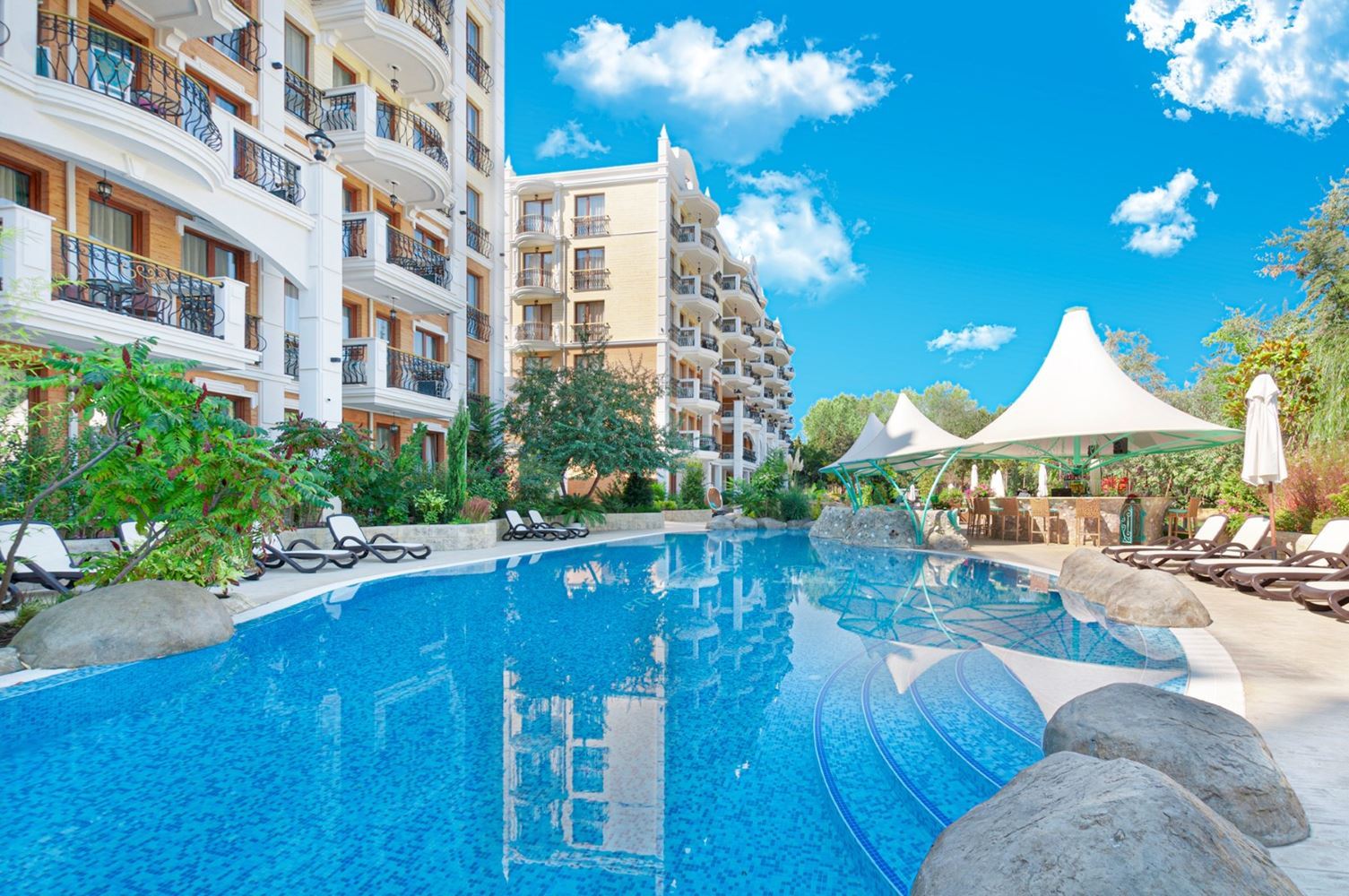 Luksusowe dwupokojowe mieszkanie z widokiem na baseny w eleganckim kompleksie w Słonecznym Brzegu