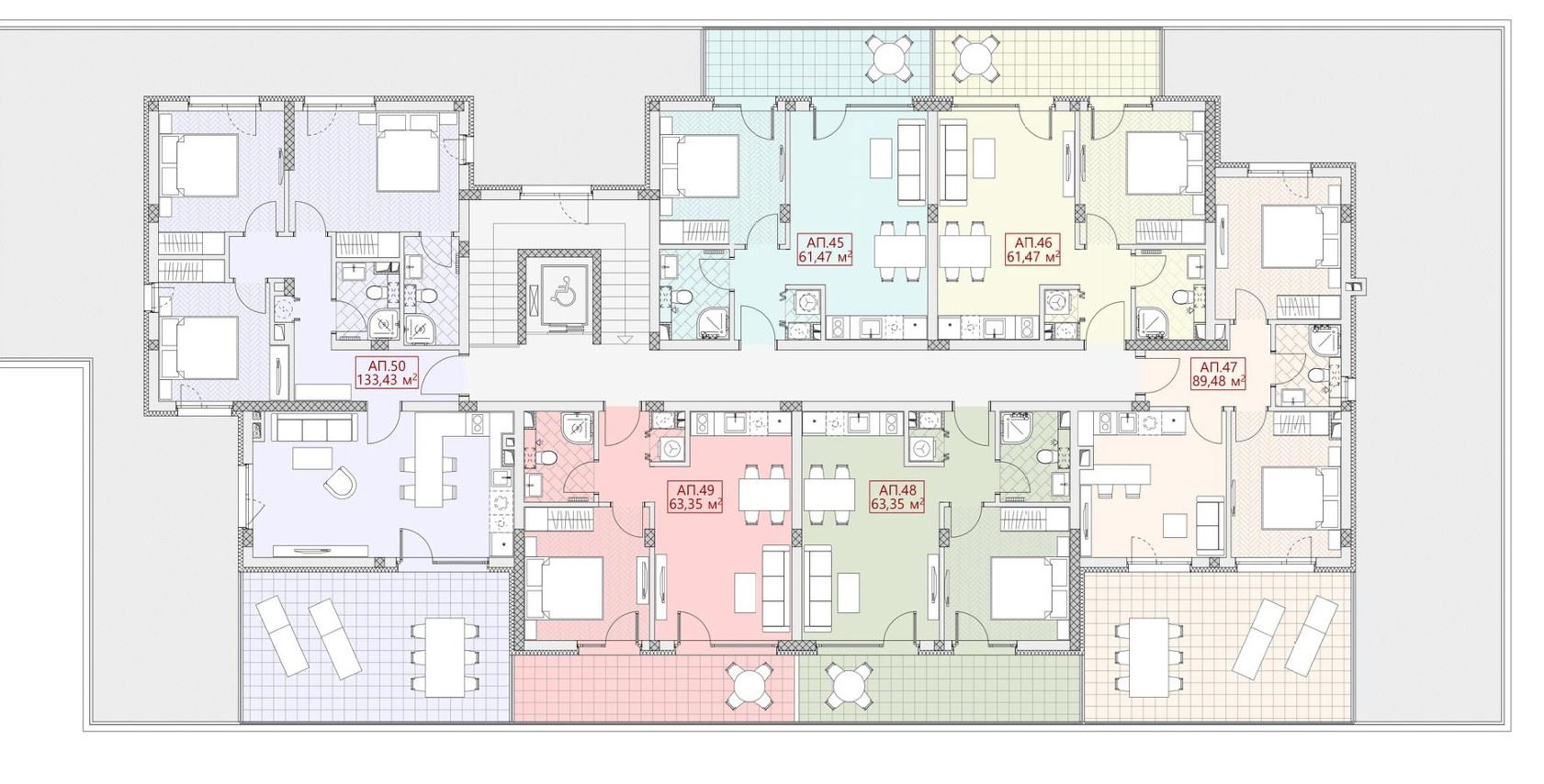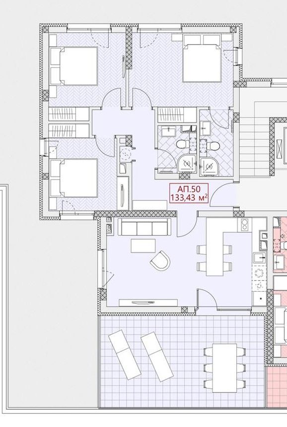 Mieszkanie znajduje się na szóstym piętrze i ma powierzchnię 133,43 m², zapewniającą przestrzeń i funkcjonalność. Przedsionek tworzy poczucie dobrze zorganizowanej przestrzeni już od wejścia i prowadzi do jasnego i przestronnego salonu z wyodrębnioną częścią kuchenną, zaprojektowaną tak, aby zapewnić maksymalną wygodę zarówno na co dzień, jak i podczas przyjmowania gości. Duże okna zapewniają dużo naturalnego światła i poczucie przestronności. Trzy sypialnie są oddzielne, mają regularne kształty i możliwość pełnego umeblowania, co czyni je odpowiednimi zarówno dla rodziny, jak i jako pokój gościnny lub gabinet. Dwie łazienki z WC są zaprojektowane w nowoczesnym stylu, a przestronny panoramiczny taras oferuje przyjemne miejsce do relaksu, porannej kawy lub wieczornego odpoczynku po długim dniu.
