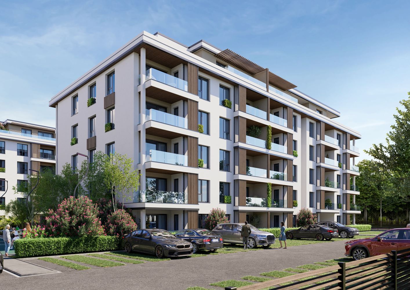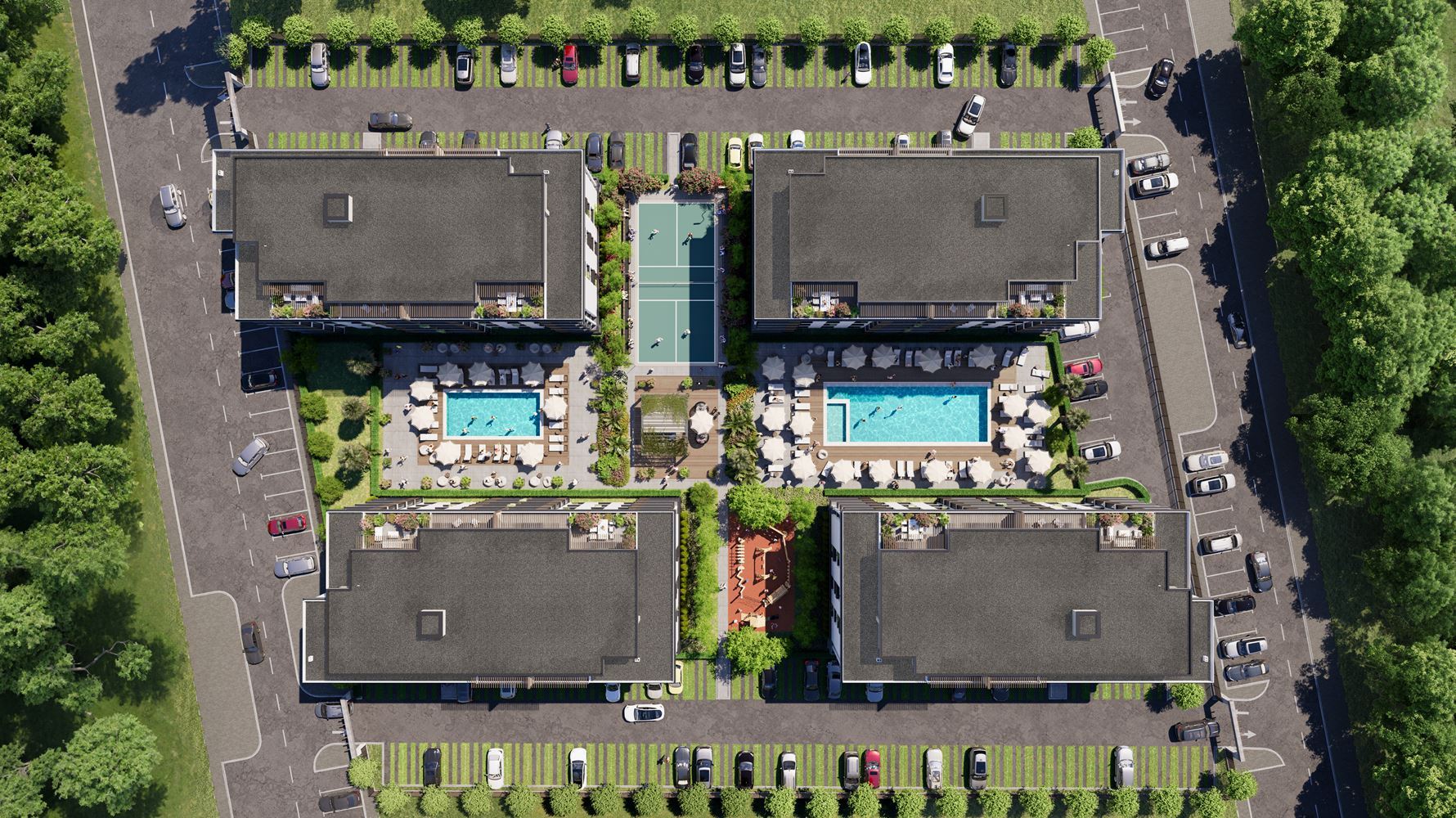 Kompleks imponuje nowoczesną architekturą i bogato zagospodarowaną zieloną przestrzenią wewnętrzną, tworząc atmosferę kurortu i spokój. Mieszkańcy będą mieli do dyspozycji dwa baseny, odpowiednie zarówno do relaksu, jak i aktywnego wypoczynku w miesiącach letnich, a także specjalnie wydzielony plac zabaw dla dzieci, zapewniający bezpieczne i zabawne środowisko dla najmłodszych. Strefa relaksu i tereny zielone oferują możliwość wypoczynku w otoczeniu natury, a boisko do pickleballa i badmintona przyczynia się do aktywnego i towarzyskiego stylu życia.