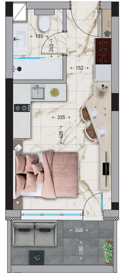 Studio zostanie oddane w standardzie „pod klucz”, umożliwiając natychmiastowe użytkowanie po zakończeniu budowy. Cena obejmuje podłogi, malowanie ścian, drzwi wejściowe i wewnętrzne, w pełni wyposażoną łazienkę z kabiną prysznicową, bojler oraz klimatyzację. Dostępna jest również opcjonalna paczka umeblowania za dodatkową opłatą, dzięki której nieruchomość będzie całkowicie gotowa do zamieszkania lub wynajmu.