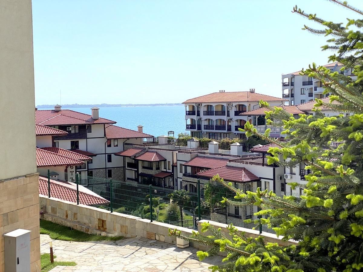 Oferujemy przytulne, słoneczne studio z panoramicznym widokiem na morze, położone w jednym z najbardziej prestiżowych kompleksów pierwszej linii w Świętym Własie. Całkowita powierzchnia: 48 m², drugie piętro, budynek z windą.