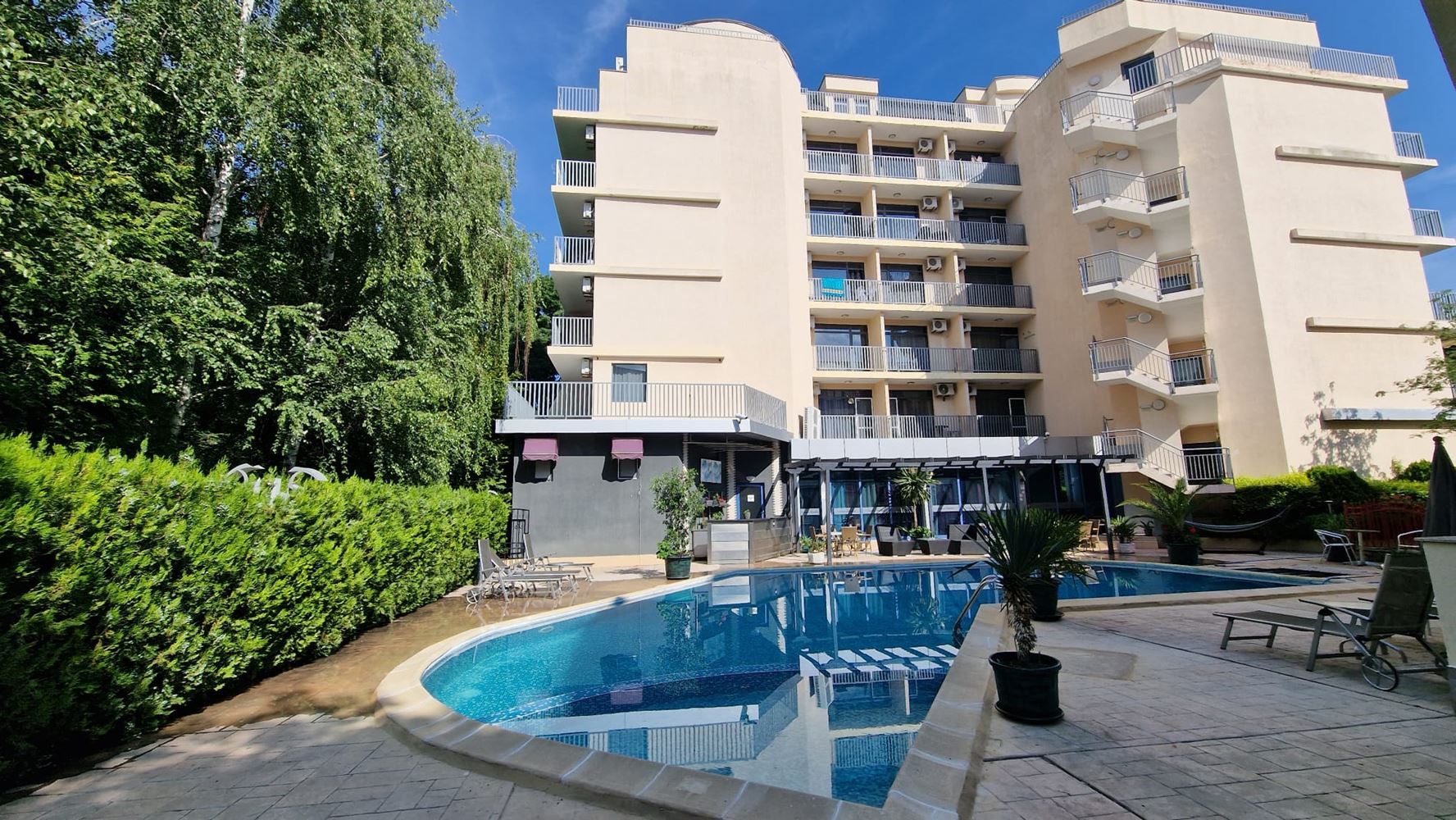 Główne cechy: 3 pokoje, 2 sypialnie, 1 łazienka, 1 balkon, powierzchnia 130 m², najwyższe piętro, winda, 300 m od plaży, centrum Słonecznego Brzegu.