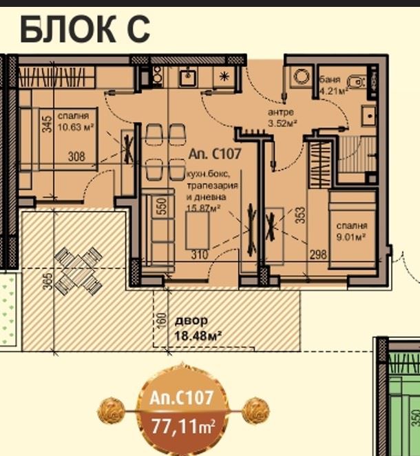 Prezentujemy nowoczesne dwupokojowe mieszkanie z prywatnym ogródkiem, położone w nowym, perspektywicznym kompleksie w Ravda, zaledwie 300 metrów od wybrzeża. Mieszkanie ma powierzchnię 77,11 m² i znajduje się na parterze, z prywatnym ogródkiem o powierzchni 18,45 m², zapewniającym dodatkową przestrzeń do wypoczynku, uprawy roślin lub przyjemnych wieczorów na świeżym powietrzu. Mieszkanie oferowane jest bez mebli, wykończone “pod klucz”, z gotową i wyposażoną łazienką, co pozwala przyszłemu właścicielowi na aranżację wnętrza według własnego gustu i stylu. Układ obejmuje przedpokój, jasny salon z aneksem kuchennym, osobną sypialnię oraz łazienkę z WC, z dostępem do prywatnego ogródka ze wszystkich głównych pomieszczeń. Dzięki temu nieruchomość jest idealnym wyborem dla rodzin, par lub osób poszukujących wygodnego mieszkania wakacyjnego lub całorocznego w pobliżu morza.