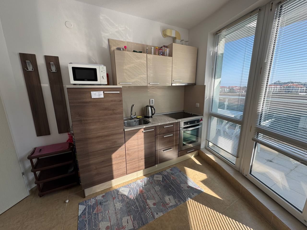 Układ: salon z aneksem kuchennym, łazienka z WC oraz balkon z widokiem na morze. Przestrzeń pozwala na wydzielenie stref do wypoczynku, jedzenia i pracy, a naturalne światło przez cały dzień tworzy atmosferę komfortu i przytulności.