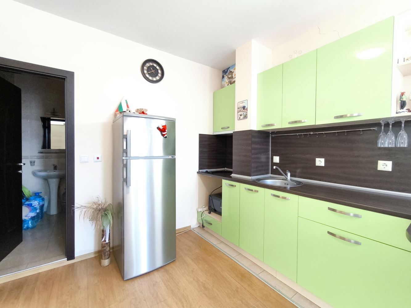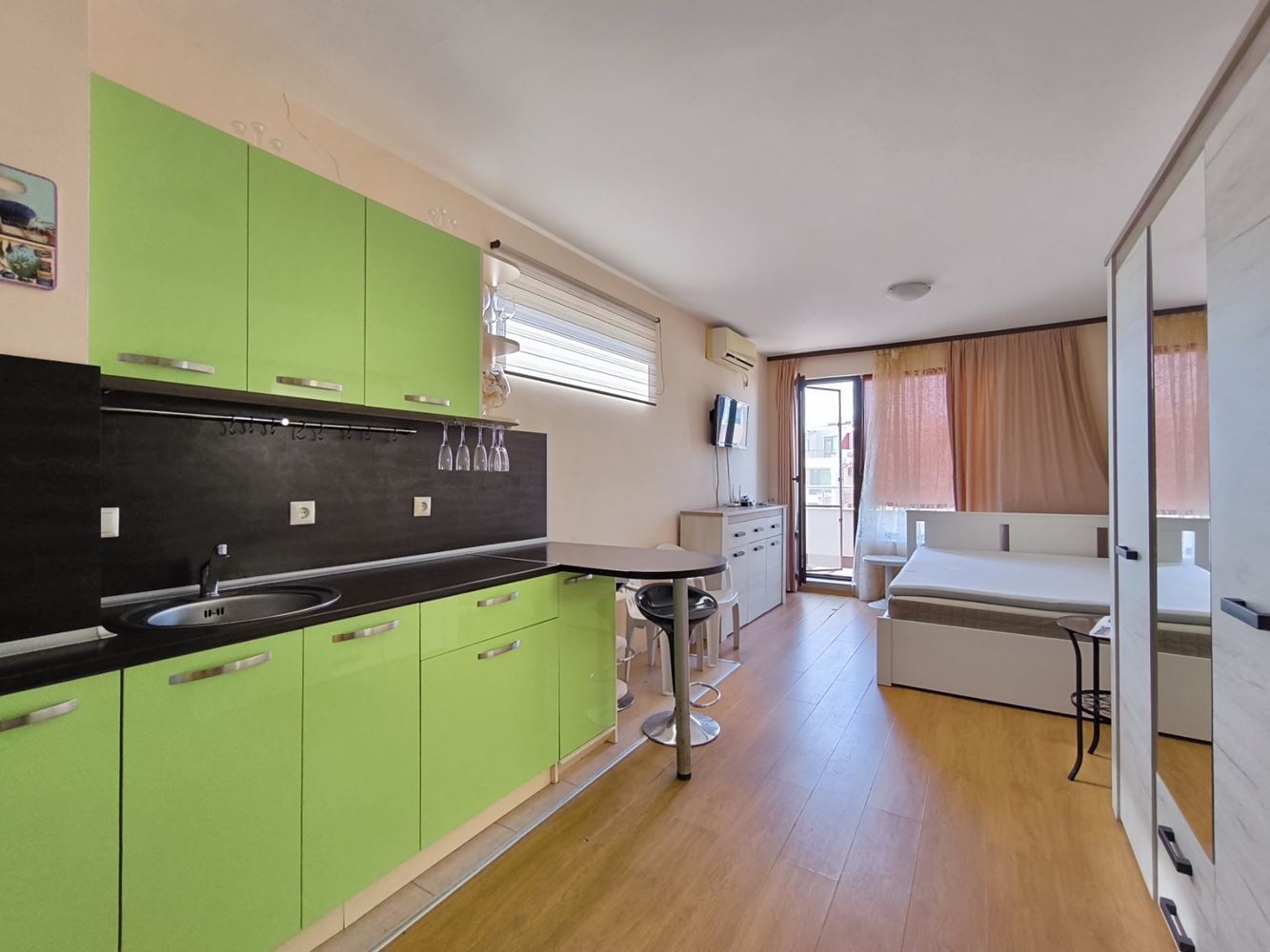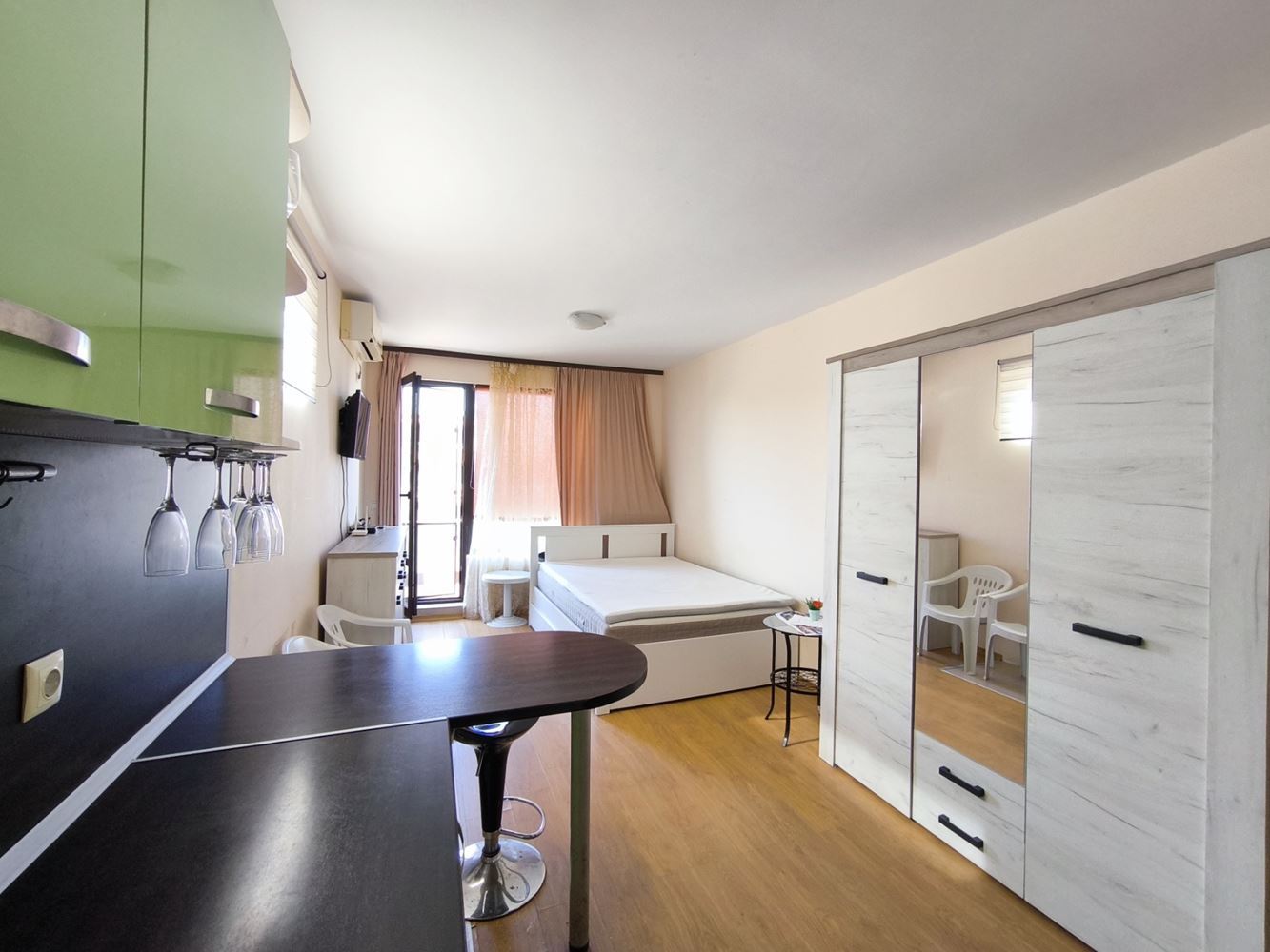 Oferujemy nowoczesne umeblowane studio, położone w starej części nadmorskiego miasta Pomorie. To prawdziwa oaza spokoju, z pięknymi widokami i wieloma udogodnieniami, które sprawiają, że życie tutaj jest wyjątkowo przyjemne i komfortowe. Studio znajduje się na czwartym piętrze i ma powierzchnię całkowitą 35 m². Zostało zaprojektowane z dbałością o szczegóły i obejmuje jasny, przestronny pokój dzienny z funkcjonalnym aneksem kuchennym oraz wygodną łazienkę. Dodatkowo, przytulny balkon idealnie nadaje się na poranną kawę lub wieczorny relaks, z widokiem na miasto.