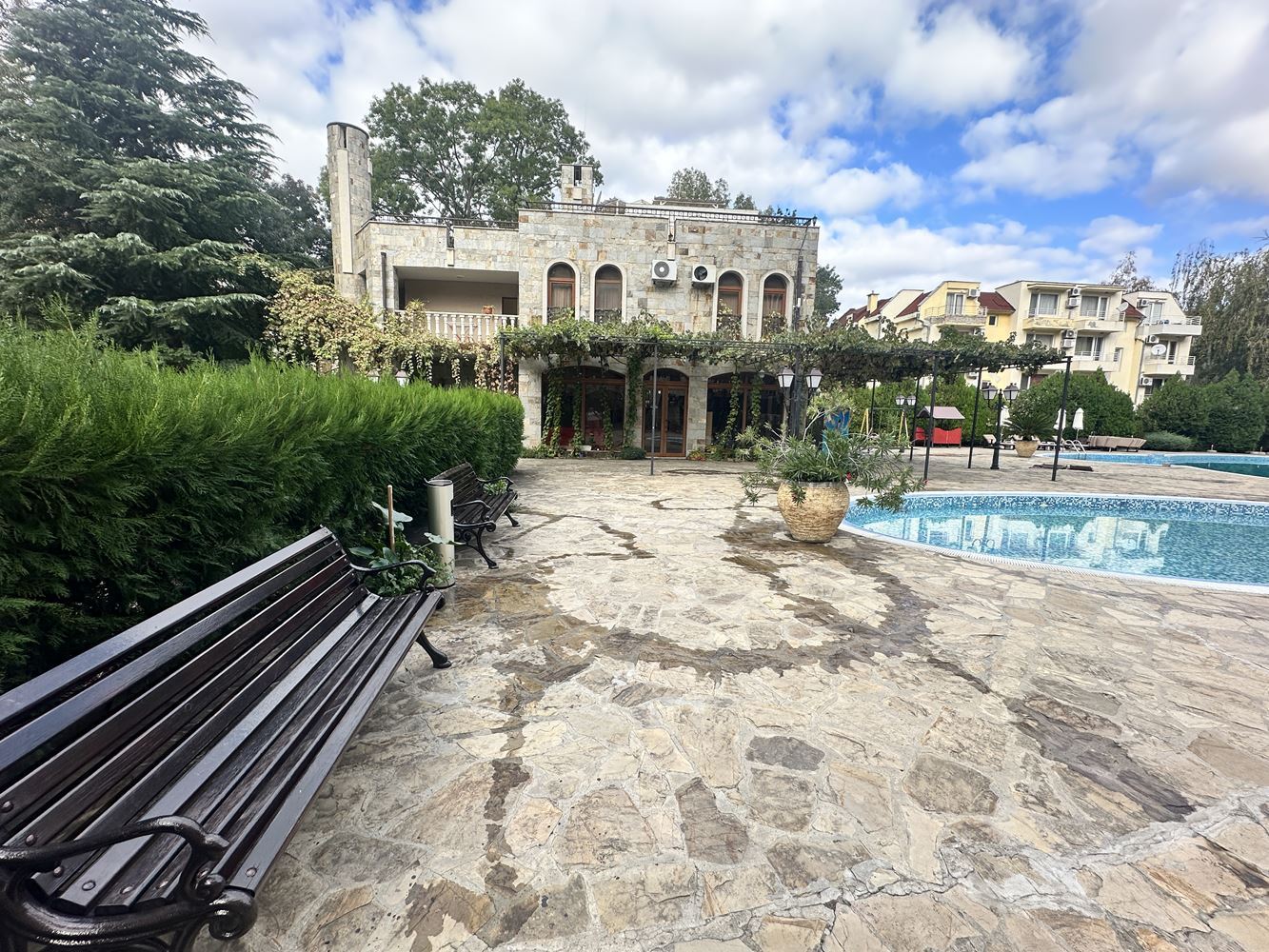 Kompleks oferuje bogatą infrastrukturę i udogodnienia dla swoich właścicieli i gości. Do dyspozycji jest basen dla dzieci i dorosłych, gdzie można się ochłodzić i cieszyć letnimi dniami w spokojnej i przyjemnej atmosferze. Dla wygody samochodów przewidziany jest garaż podziemny, który zapewnia bezpieczne miejsce parkingowe i dodatkowy komfort. Dla pełnego spokoju i bezpieczeństwa kompleks posiada ochronę i kontrolę dostępu, a także recepcję i usługi zakwaterowania, które gwarantują porządek i organizację. Dodatkowo w kompleksie znajduje się restauracja, gdzie można skosztować pysznego jedzenia i przyjemnej atmosfery, nie wychodząc z terenu.