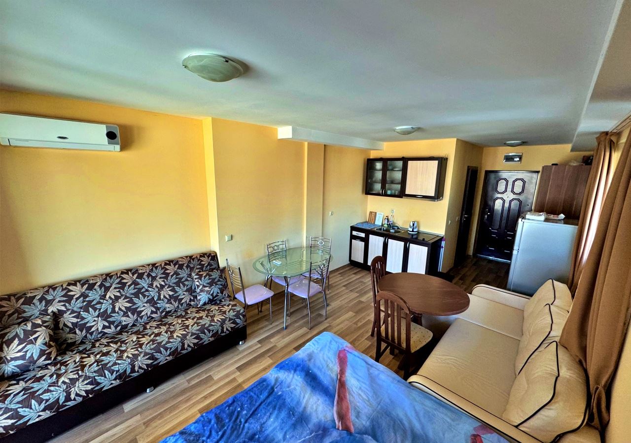 Oferujemy na sprzedaż studio o powierzchni 43 m², położone na trzecim piętrze komfortowego i dobrze utrzymanego kompleksu w Słonecznym Brzegu. Nieruchomość sprzedawana jest w pełni umeblowana i wyposażona, gotowa do natychmiastowego użytkowania, co czyni ją idealną zarówno jako dom wakacyjny, jak i inwestycję z potencjałem wynajmu.