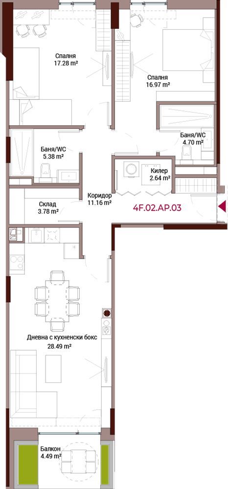Odkryj idealne połączenie elegancji, komfortu i nowoczesnych technologii w tym trzypokojowym mieszkaniu na 2. piętrze, o powierzchni zabudowanej 111,72 m², całkowitej powierzchni 142,29 m² oraz z zagospodarowanymi tarasami o łącznej powierzchni 157,53 m². Mieszkanie obejmuje przestronny hol wejściowy, jasny salon z wyjściem na taras, dwie sypialnie, dwie łazienki, schowek oraz pomieszczenie gospodarcze – wszystko zaprojektowane z ponadczasową elegancją, inspirowaną charakterystyczną architekturą Sofii.