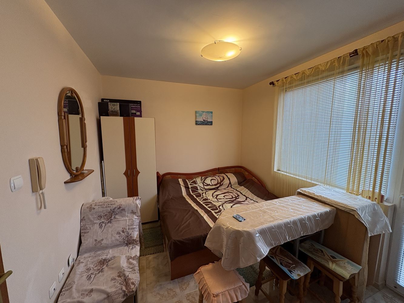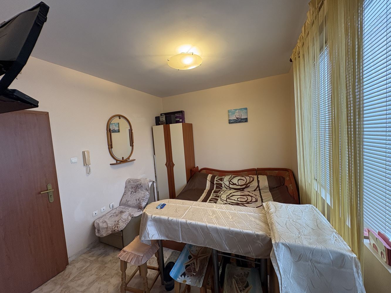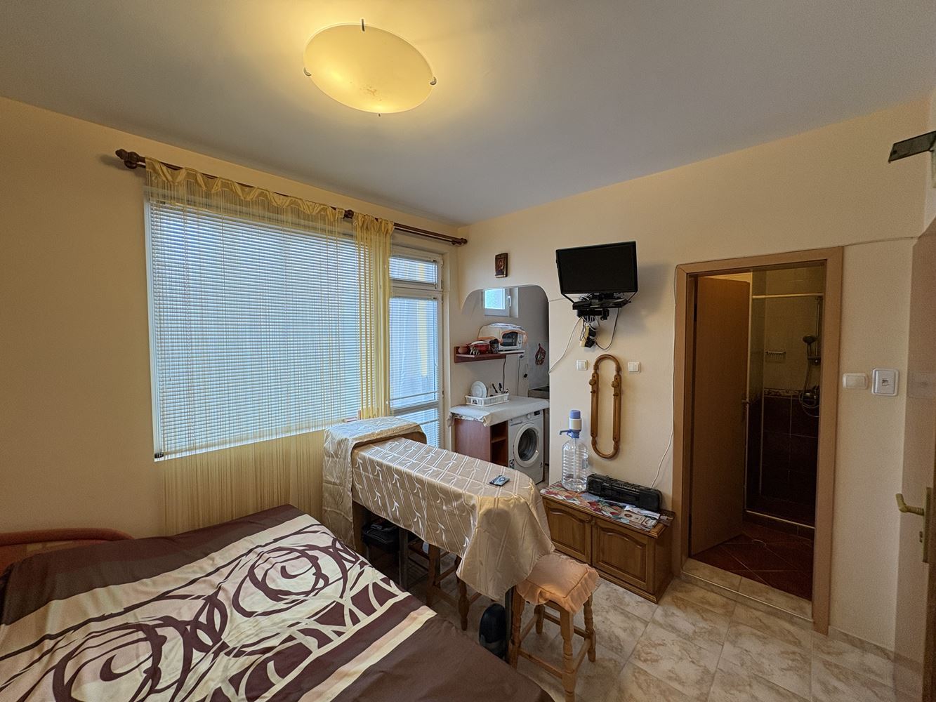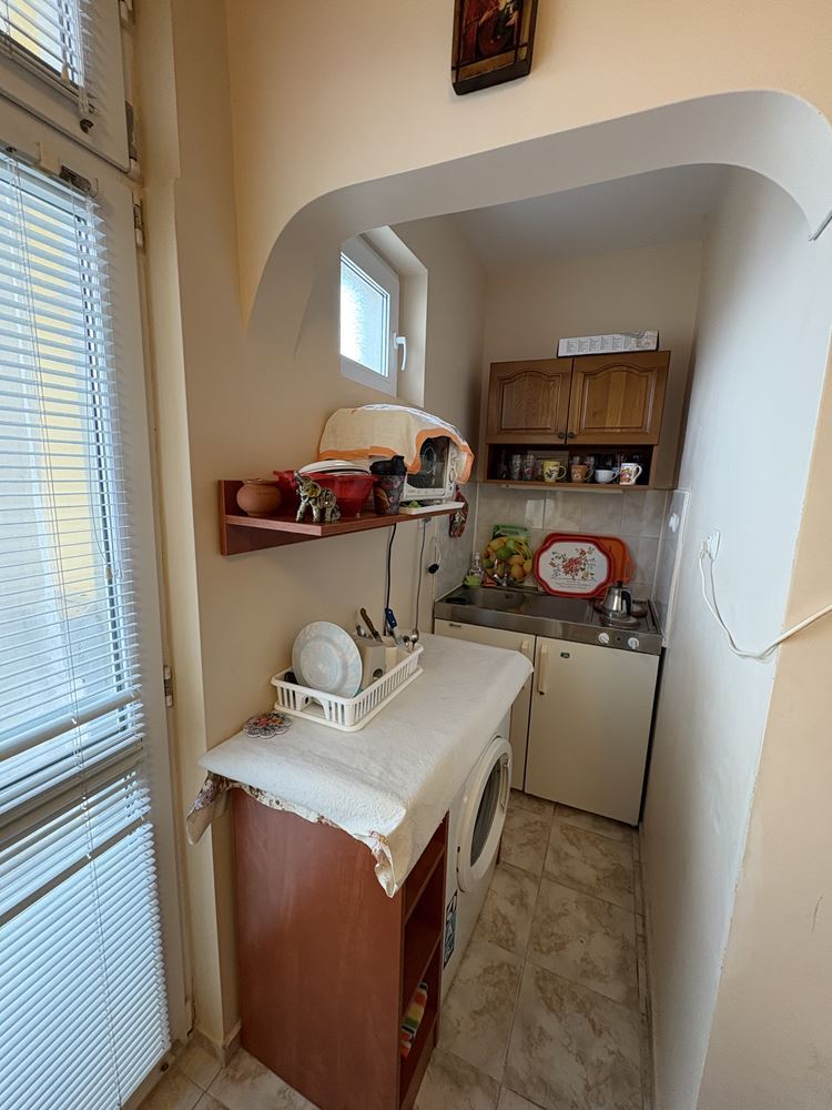 Przedstawiamy funkcjonalne i przytulne studio na sprzedaż w Pomorie, położone przy spokojnej ulicy w pobliżu TMarket. Nieruchomość znajduje się zaledwie 400 metrów od morza i 300 metrów od centrum miasta – lokalizacja, która łączy wygodę, łatwy dostęp do wszystkich usług i przyjemną, nadmorską atmosferę. Studio ma powierzchnię całkowitą 30 m², znajduje się na drugim piętrze w budynku z windą i pozwoleniem na użytkowanie (Act 16). Zachodnio-północna ekspozycja zapewnia komfortowy klimat w ciepłych miesiącach i przyjemne popołudniowe światło. Z okien roztacza się widok na szpital, a wszystkie udogodnienia miejskie są w bliskim zasięgu.