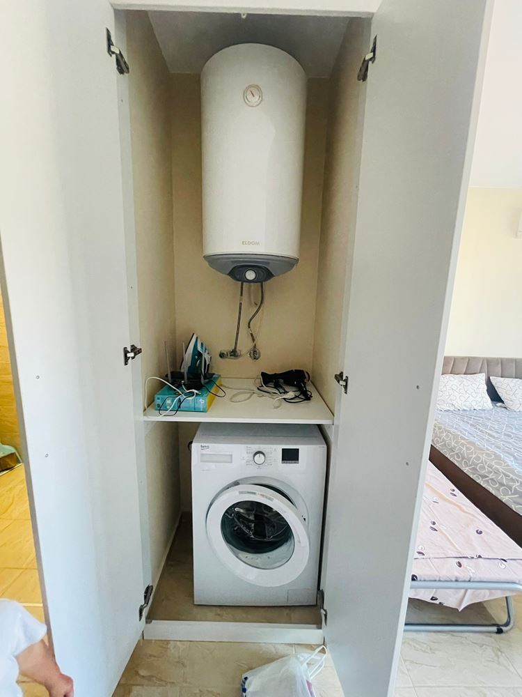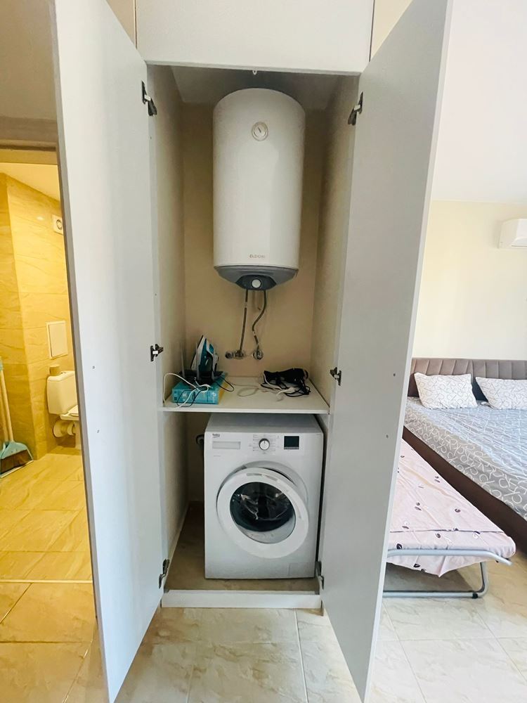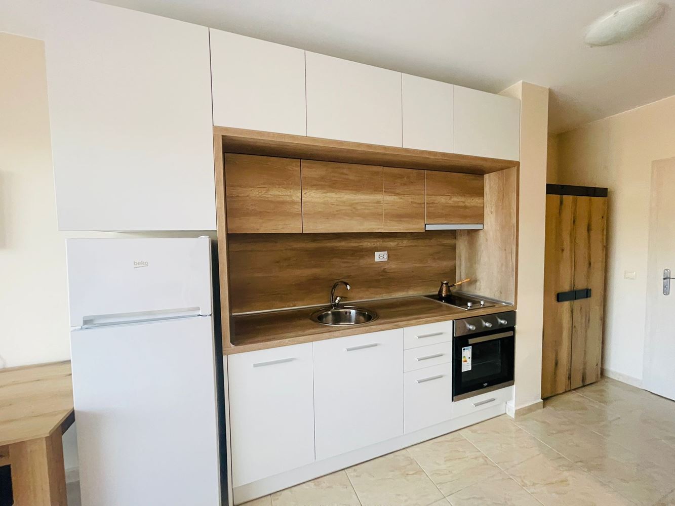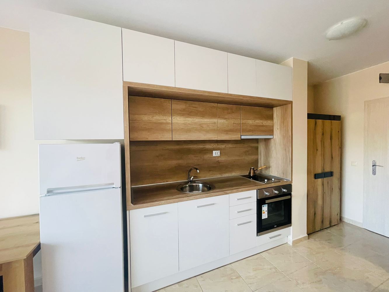 Studio jest stylowo umeblowane i wyposażone w zupełnie nowe meble i sprzęt, gotowe do natychmiastowego zamieszkania. Kuchnia została wykonana na zamówienie, funkcjonalnie zaprojektowana i w pełni wyposażona: wbudowana płyta grzewcza, piekarnik i pralka – wszystko, co potrzebne do wygody domowej. Jasna część mieszkalna jest dobrze zorganizowana, z wystarczającą ilością miejsca na kącik sypialny, relaks i posiłki, a duże okna potęgują poczucie przestrzeni i przytulności. Łazienka jest przestronna, wyposażona w wysokiej jakości elementy sanitarne i praktycznie rozplanowana. Taras jest szeroki i wygodny – idealny na poranną kawę lub wieczorny wypoczynek, z przyjemnym widokiem na góry i zieleń kompleksu.