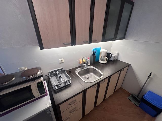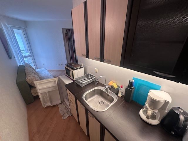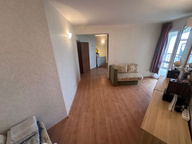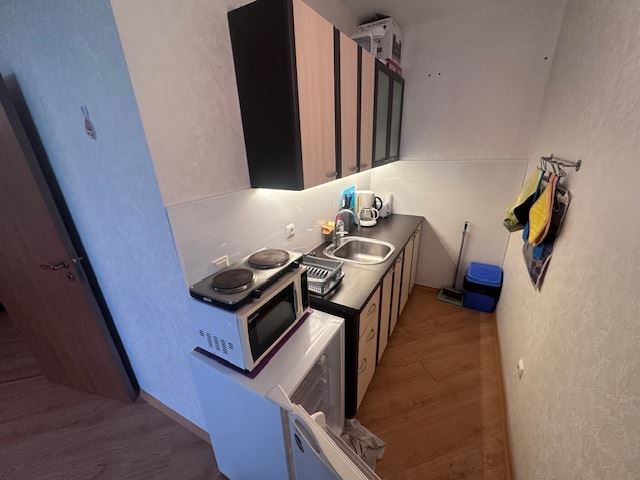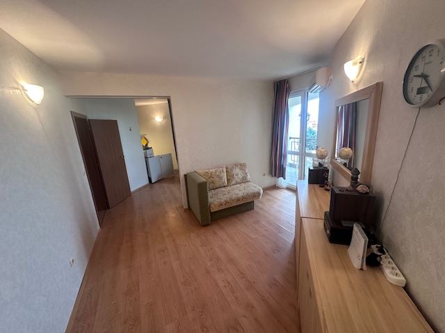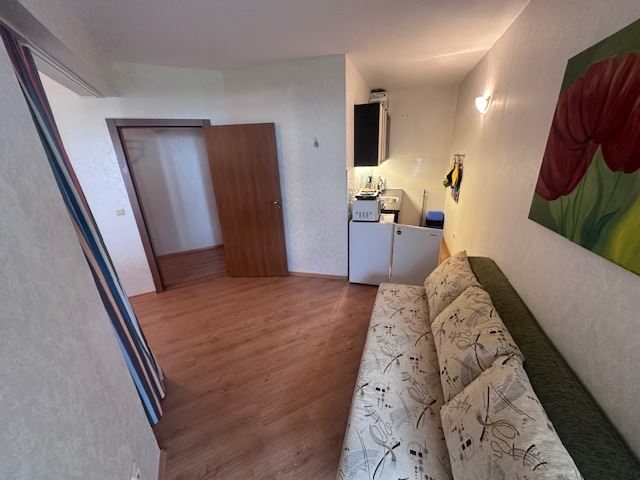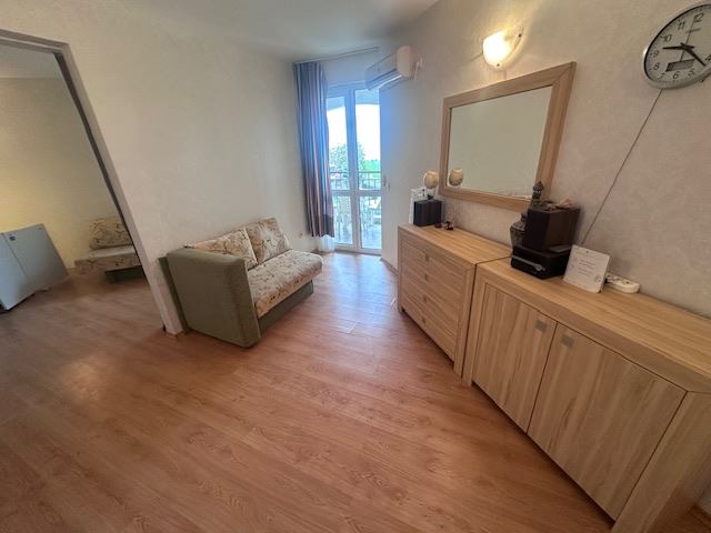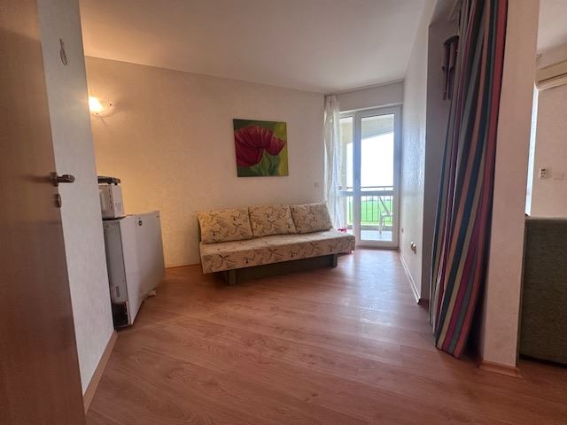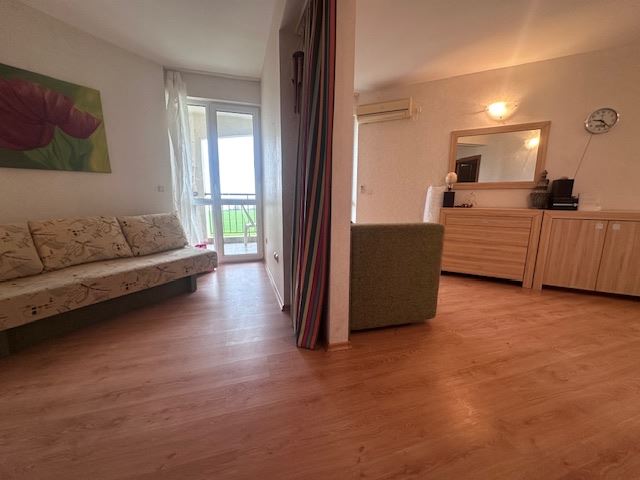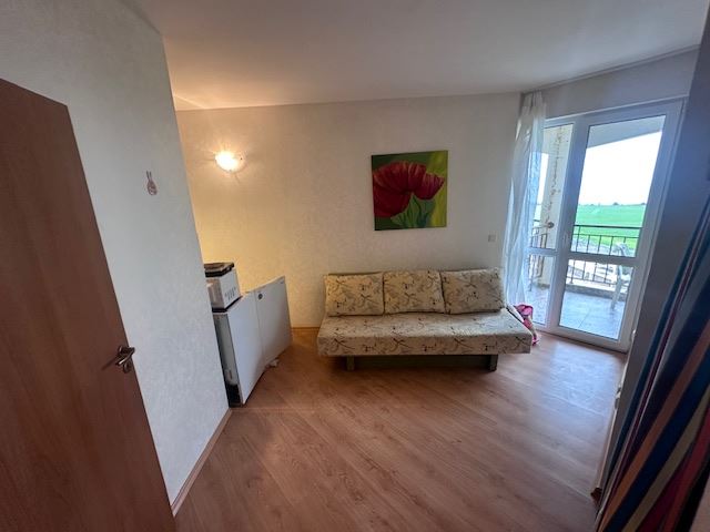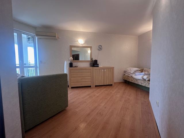 Studio składa się z przestronnego, jasnego przedpokoju prowadzącego do pokoju dziennego z aneksem kuchennym, miejscem jadalnianym i strefą relaksu. Duże okna zapewniają doskonałe doświetlenie, a układ pomieszczeń pozwala w pełni wykorzystać przestrzeń. Atutem jest taras z pięknym widokiem na morze i basen. Łazienka jest wygodna i nowocześnie wyposażona.