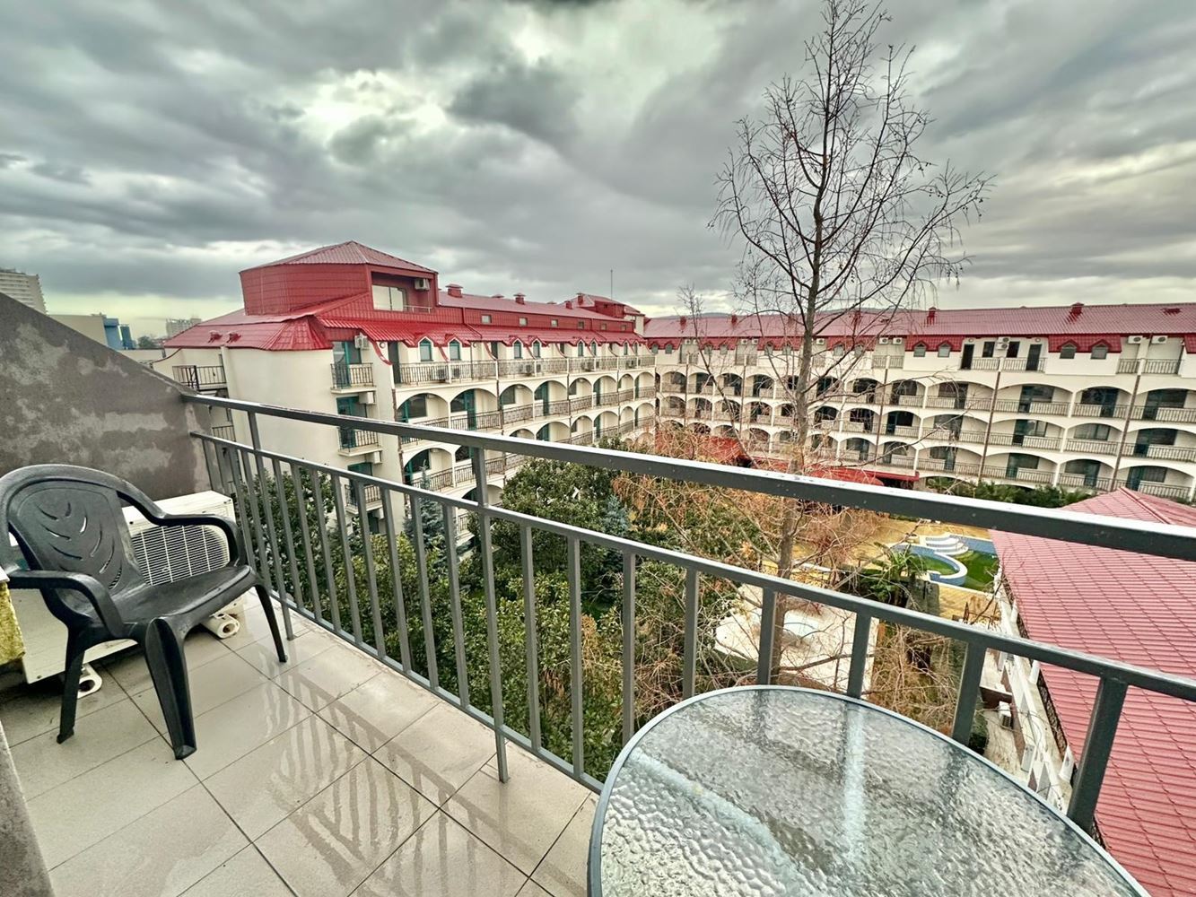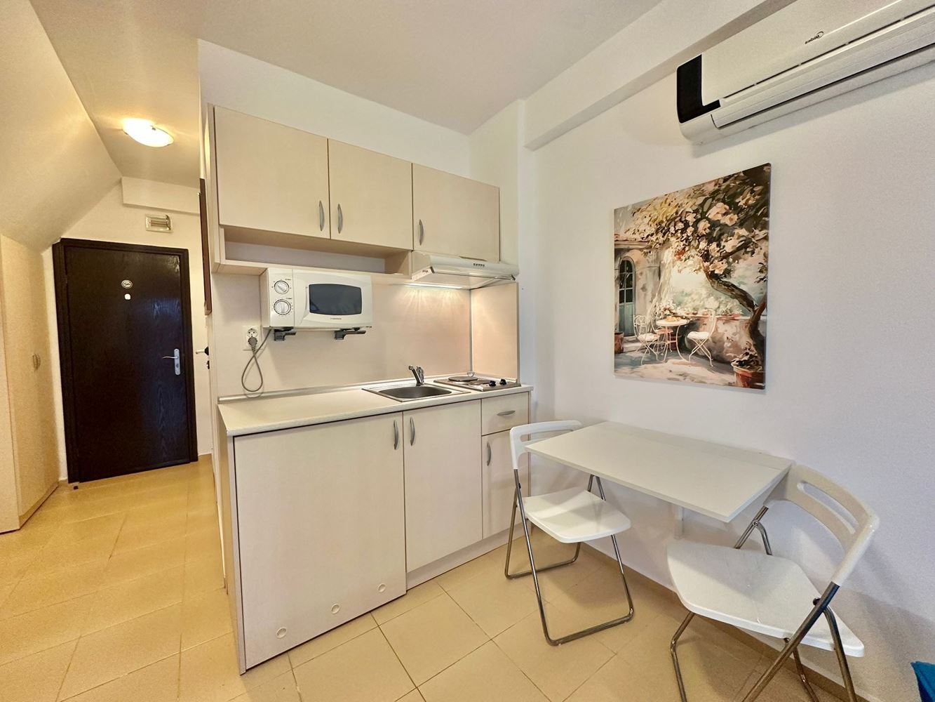 Lokalizacja jest bardzo wygodna – zaledwie 7–8 minut spacerem od plaży, a centrum kurortu z wszystkimi sklepami, kawiarniami, restauracjami, aptekami i transportem publicznym również w pobliżu. Studio łączy komfort, funkcjonalność i atrakcyjną lokalizację, idealne na życie wakacyjne lub dochodową inwestycję.